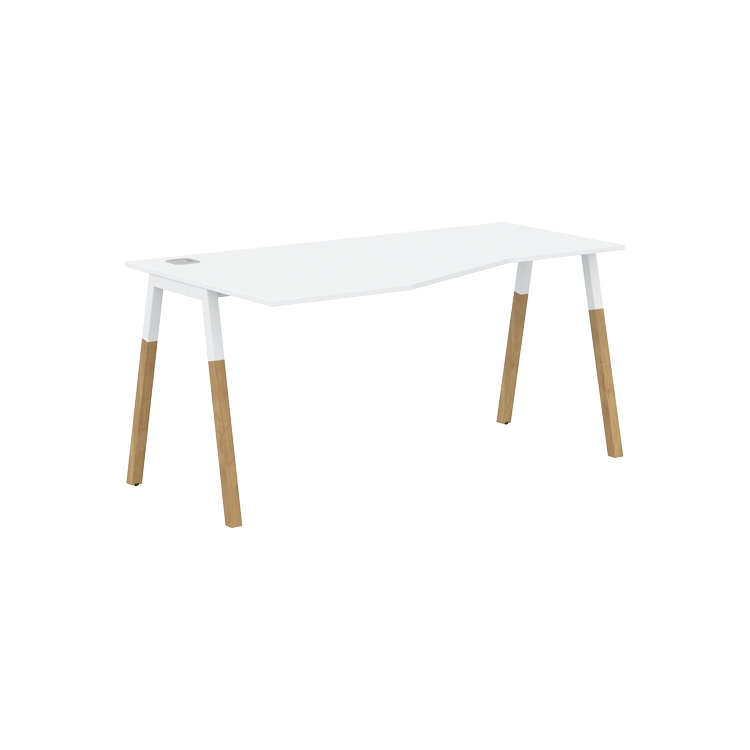 Столешница эргономичная из ЛДСП т.18 мм. c кромкой ABS т.2 мм, комплектуется квадратной заглушкой кабель-канала слева или справа, 2-мя траверсами и комбинированными опорами А-образной формы, верхняя часть из профиля трубы 40х40 мм и нижняя часть из массива бука; отделка – масло-воск.